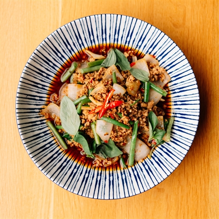 Malið svínakjøt, kili, hvítleykur, grønar bønir, leykur, basilikum